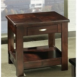 Somerton - End Tables - 41502 - A dignified contemporary silhouette is exhibited by the Somerton Serenity End Table with its rich brown finish and sturdy construction. The hardwood construction and professional light gloss finish of this end table offers two surfaces to rest your keepsakes upon and a single drawer to tuck away odds and ends. Unique thick triangle shaped legs and curved brushed silver tone hardware stand the test of time and add to the simple artistry of this piece. The Serenity Collection by Somerton conveys exactly that, the serene comforts of home. Familiar contemporary silhouettes are enhanced by exquisite Somerton touches of design, which show the kind of care they put in to their creations. While the rich brown finish and the brushed silver external hardware warms up any atmosphere. Available in Rich Brown finish 1 drawer Brushed silver tone external hardware Light gloss finish Contemporary solid triangle shaped legs Constructed of solid rubber wood and Primavera veneers Specifications: Overall Dimensions: 24芒鈧? H x 24芒鈧? D x 27芒鈧? W Weight: 66.13