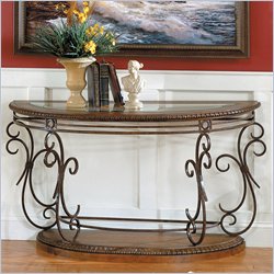 Standard Furniture - Console Tables - 21257 - Bring a taste of the Old World into your living room with this elegant Standard Crescendo Sofa Table. With a simulated leather finish on engineered wood products, the Crescendo Sofa Crescendo occasional tables fashion thick beveled glass, fancy metal scrollwork legs, and detailed dental molding pattern imprinted on Crescendo's base and table tops. Finish: Brown Shape: Free form Table top material: Glass top Dimensions: 30 H x 54 W x 20 D